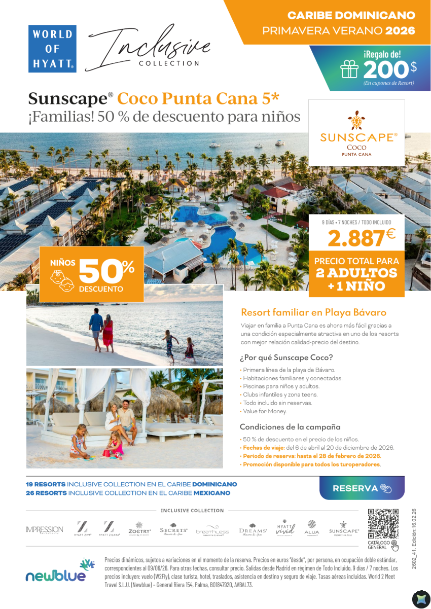 50% NIÑOS Sunscape Coco Car. Dominicano por solo 2.887€ para 2 Adultos + 1 Niño